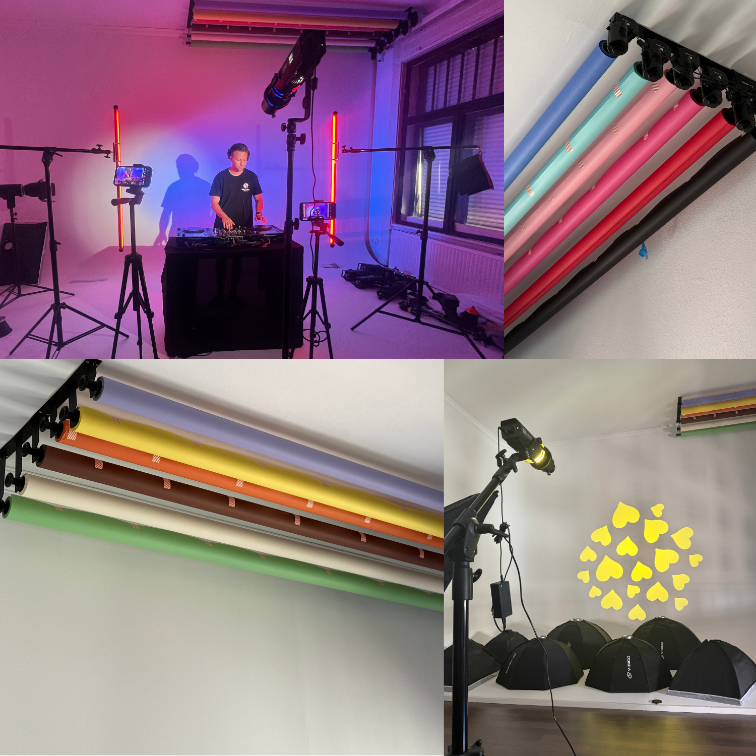 6 méteres, végtelenített cikloráma falunk mellé elektromos konzolokon 12 különböző színű háttér és 2 dekorfal is rendelkezésre áll – hogy minden vizuális elképzelésed valóra válhasson.